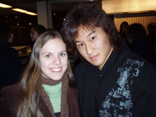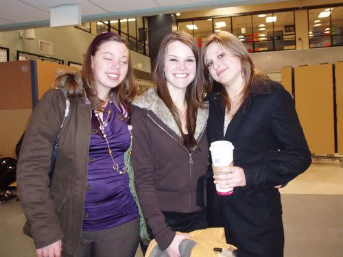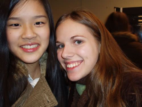 After school I sat in front of my locker and read more Lord of the Flies. Eventually I got Mikhael out of wrestling, and we ate dinner and hung out with all of the other people who were going to the opera. People were being mean to me for not wearing black and/or white, and to Mikhael for wearing jeans. I secretly laughed later, at all f the girls who were cold from wearing thin clothing or with bare legs, it being minus ten, and the guys because they were way too over-dressed in their suits. I was wearing a fuzzy green turtleneck with a black tanktop over top, a brown blazer, a brown scarf, gloves, my fifties schoolteacher, wool skirt and two pairs of nylons, light brown with dark brown overtop.